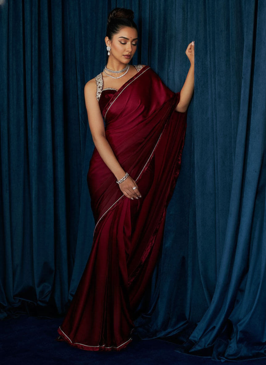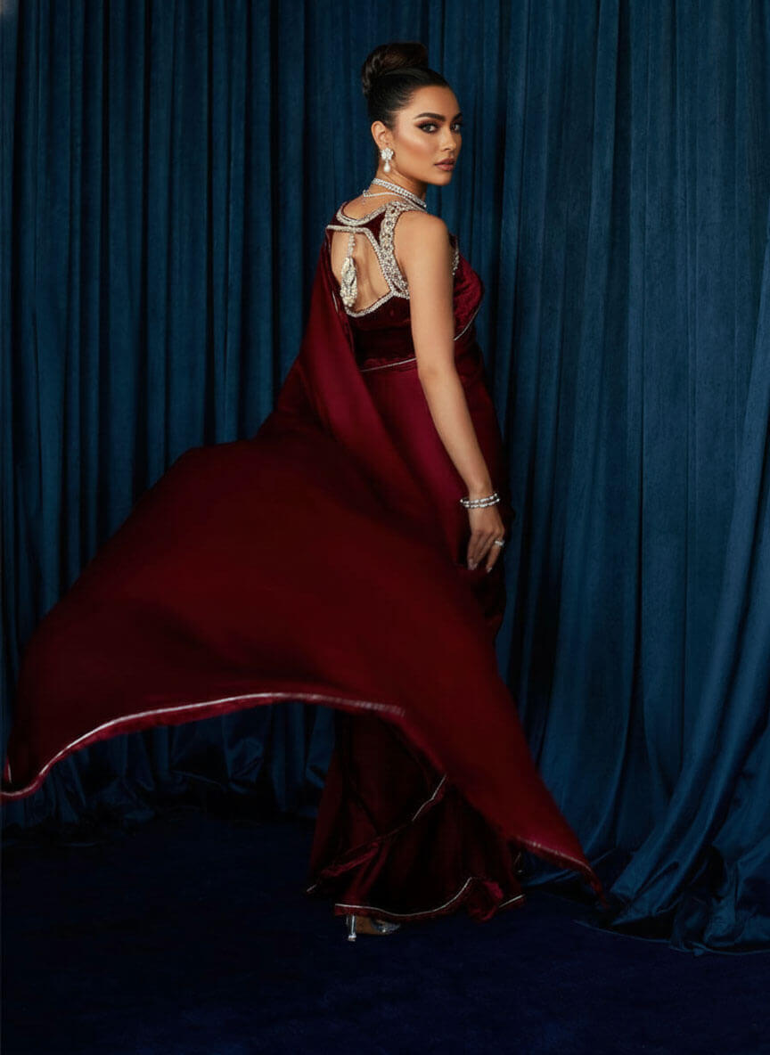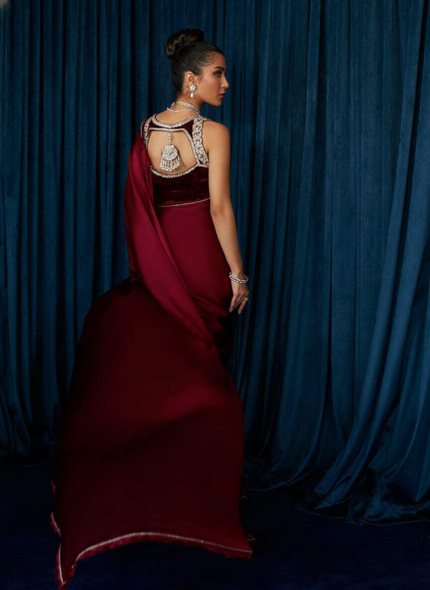 Step into any grand celebration with unforgettable charm as Qimra Clothing presents Celestine, crafted for women who love making an entrance. This pre-draped, stitched saree features cascading yards of crimson Charmeuse silk with a striking ombré effect, finished with a velvet border, lace layering, and delicate silver gota. The plush velvet halter blouse steals the show with scalloped straps, rich silver nakshi, and Swarovski crystal handwork, complete with statement tassels on the back. Perfect for weddings, receptions, and high-profile soirées, this masterpiece blends timeless glamour with modern drama.