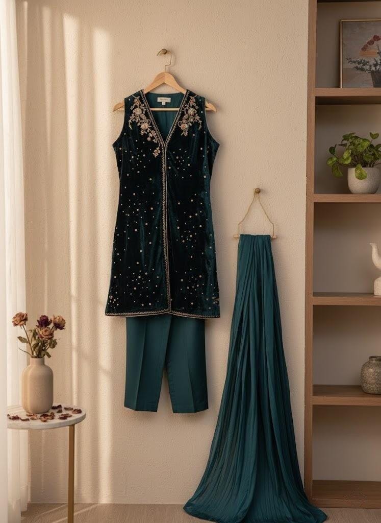 A tribute to the opulence of bygone eras, reimagined with a bold, modern twist. This radiant velvet shirt, in a rich deep teal, is exquisitely embellished with intricate hand-worked tilla, sequins, and silk thread detailing. The contemporary front-open design and thigh-skimming cut lend a fresh, flattering silhouette, while the pure silk shalwar, adorned with stunning gold embroidery, completes the look with timeless elegance.