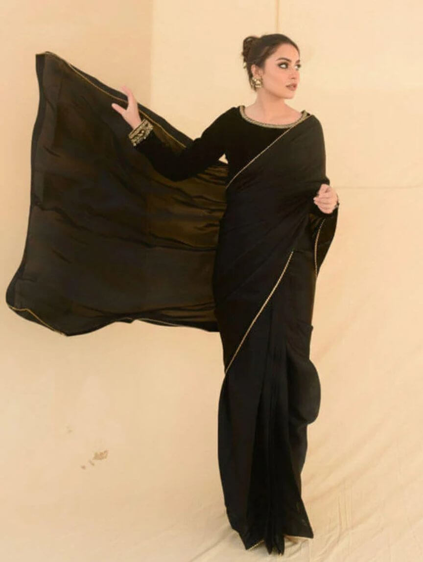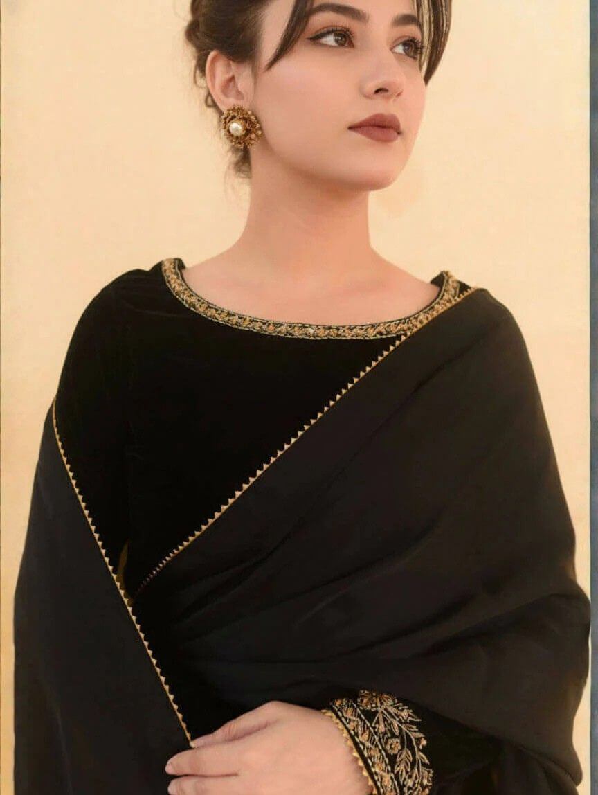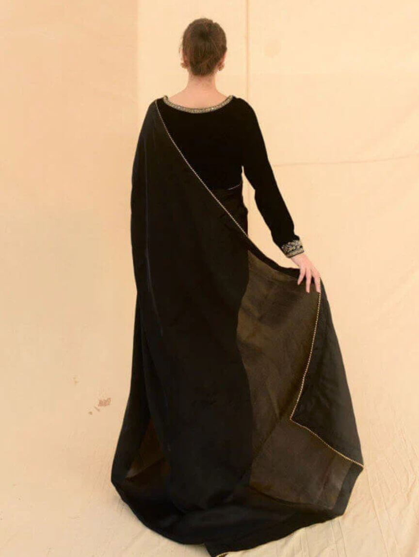 Elevate your festive and evening party looks with this Dark Eclipse saree, where tradition meets modern glam. The velvet blouse dazzles with intricate handwork on the neckline, sleeves, and back, perfectly paired with a silk saree featuring delicate gotta finishing and stitched pleats for that effortless twirl factor. The malai crepe petticoat ensures a flawless fit, making this ensemble totally slay-worthy. Add a subtle sparkle by pairing it with Qimra bangles, and you’re ready to steal the spotlight at weddings, celebrations, or elegant night-outs.