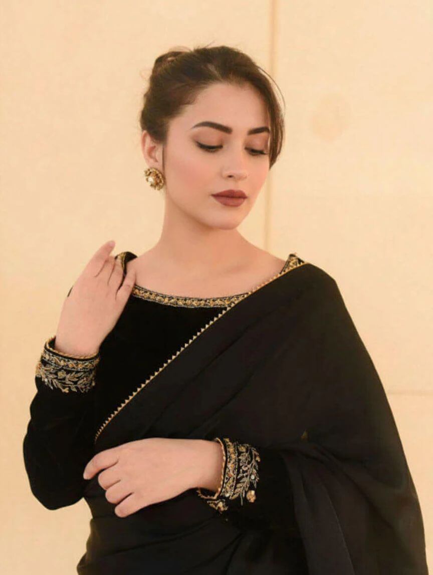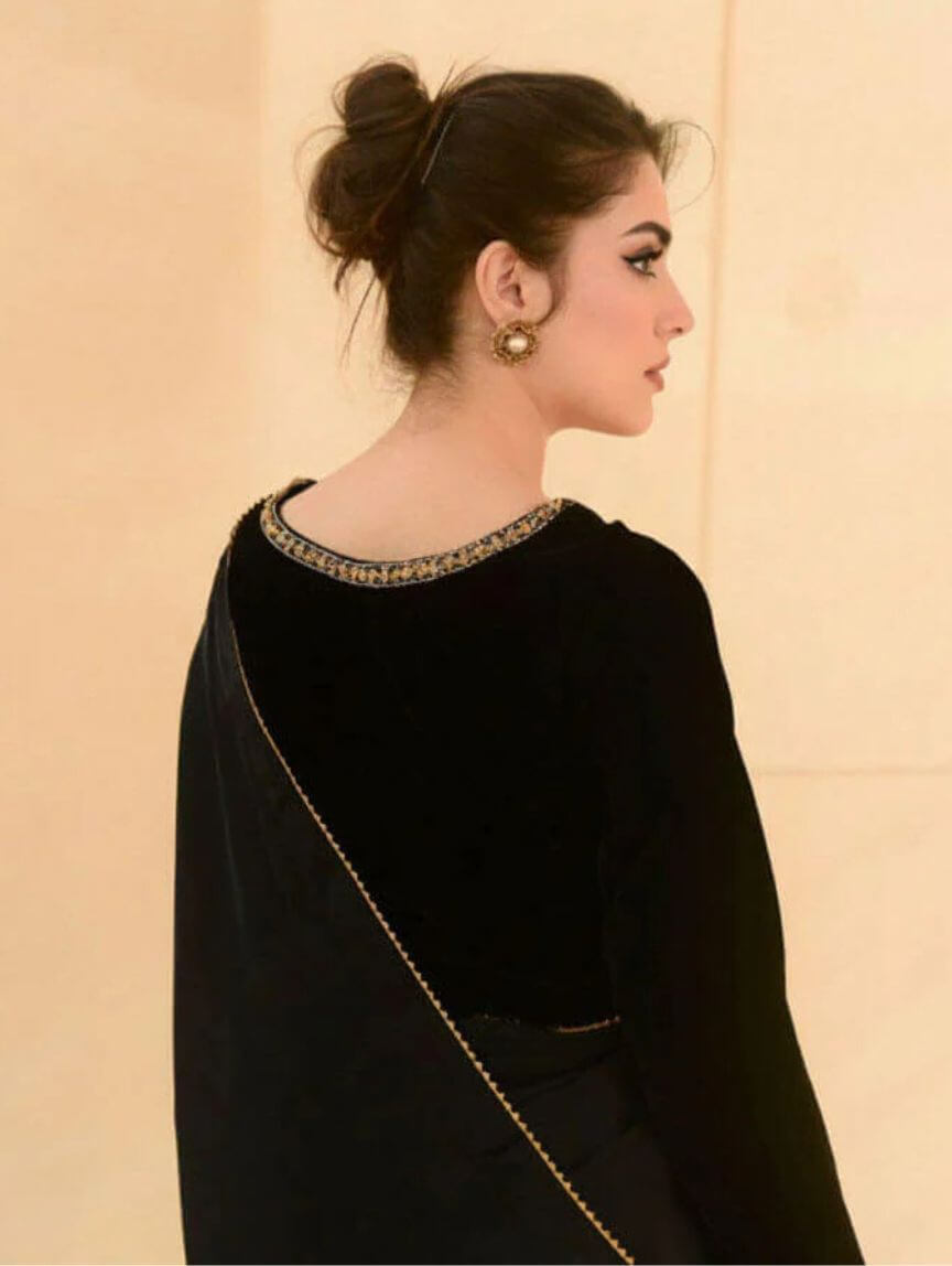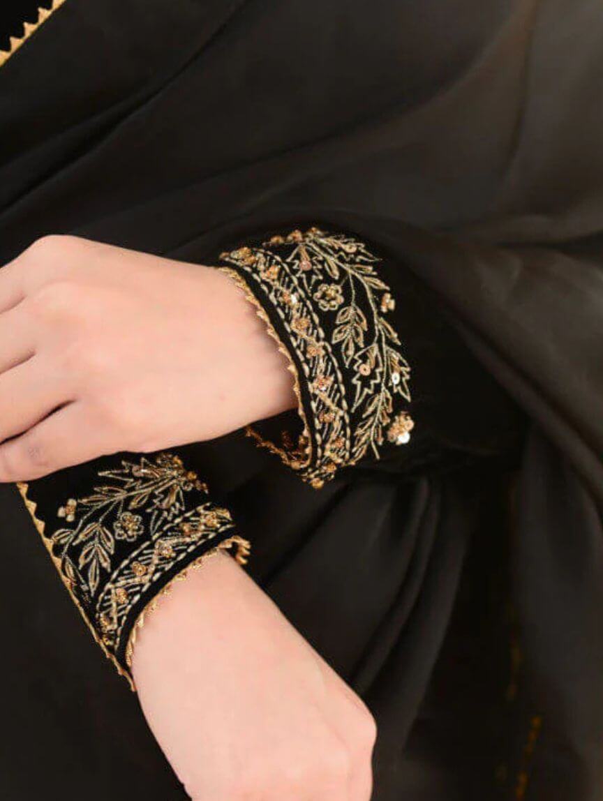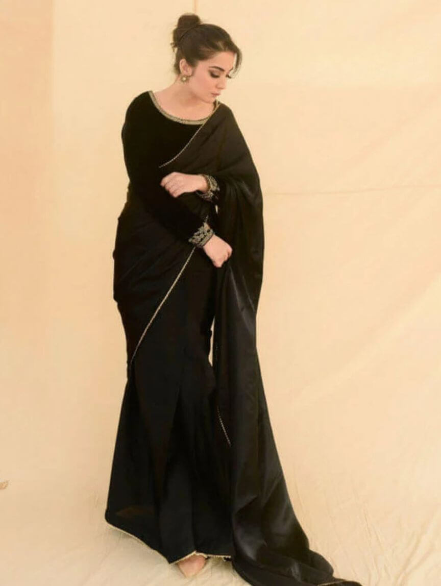 Elevate your festive and evening party looks with this Dark Eclipse saree, where tradition meets modern glam. The velvet blouse dazzles with intricate handwork on the neckline, sleeves, and back, perfectly paired with a silk saree featuring delicate gotta finishing and stitched pleats for that effortless twirl factor. The malai crepe petticoat ensures a flawless fit, making this ensemble totally slay-worthy. Add a subtle sparkle by pairing it with Qimra bangles, and you’re ready to steal the spotlight at weddings, celebrations, or elegant night-outs.