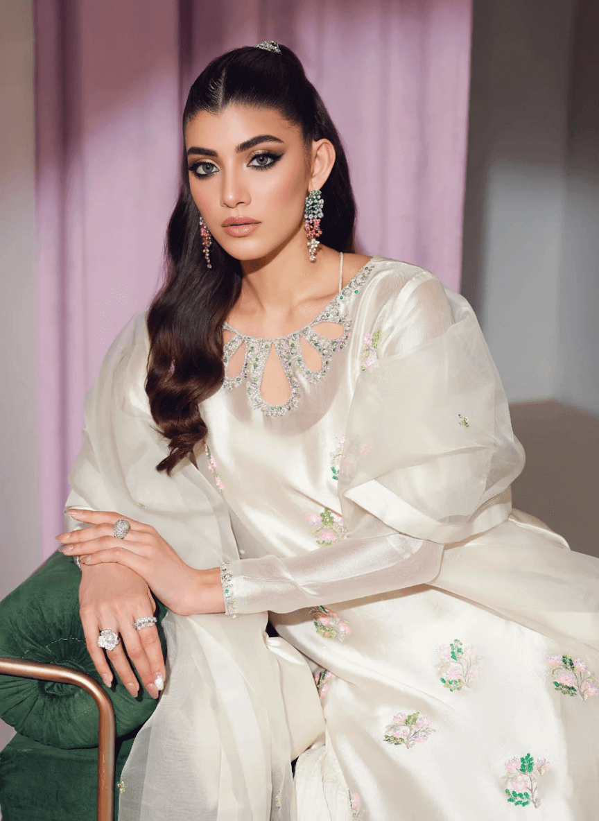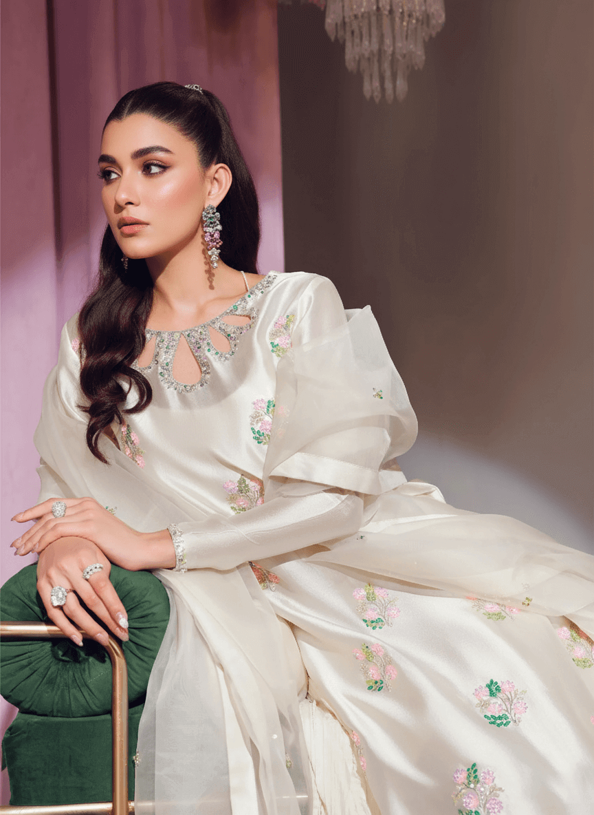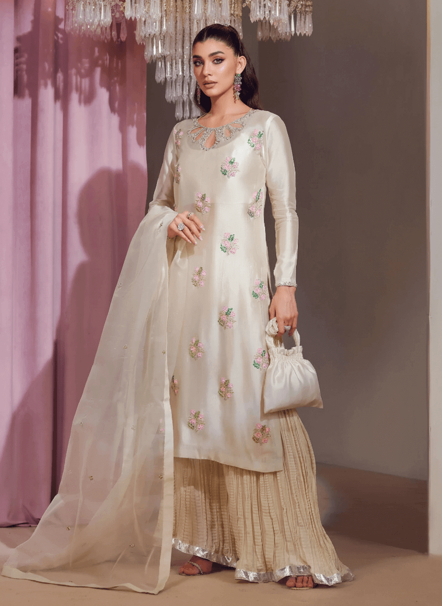 This stunning ivory outfit is beautifully handcrafted with colorful sequins and bugle beads on a luxurious silk tissue shirt, creating a graceful, festive look. It is paired with ivory sharara pants in pk. raw silk and completed with a chun organza dupatta, adding the perfect traditional touch.