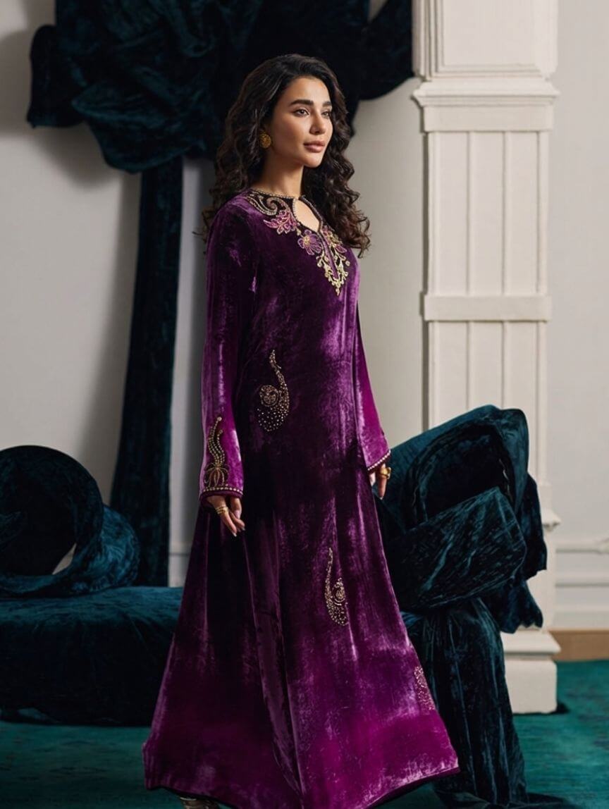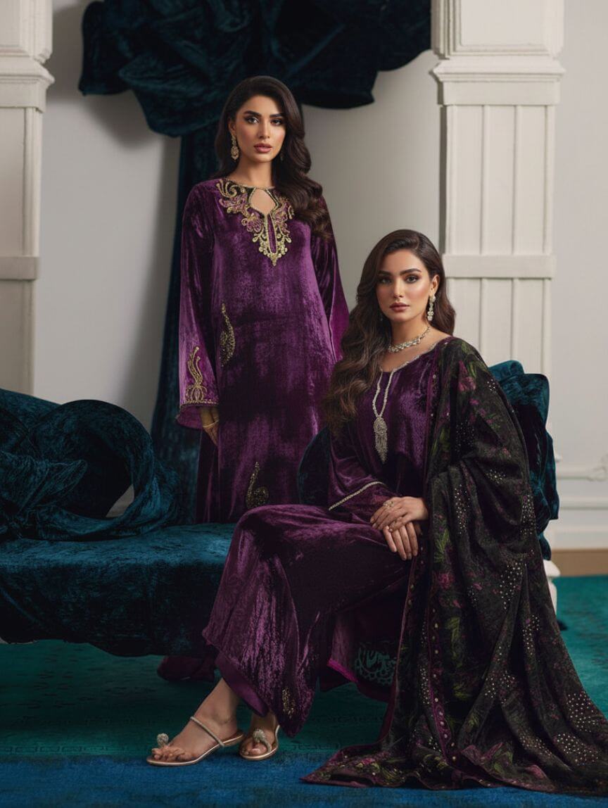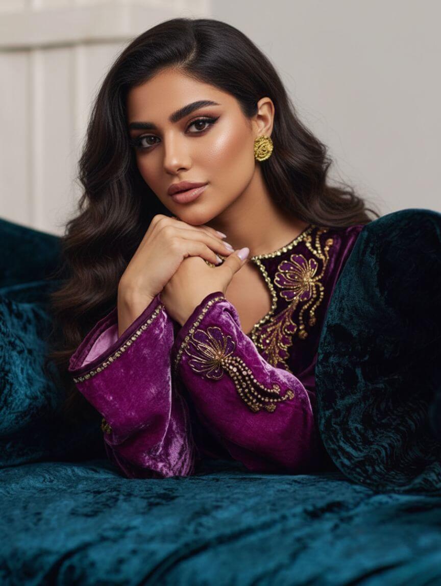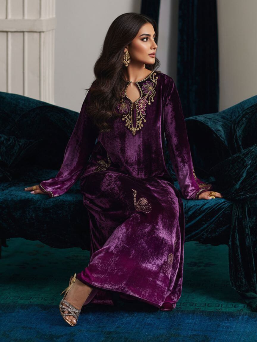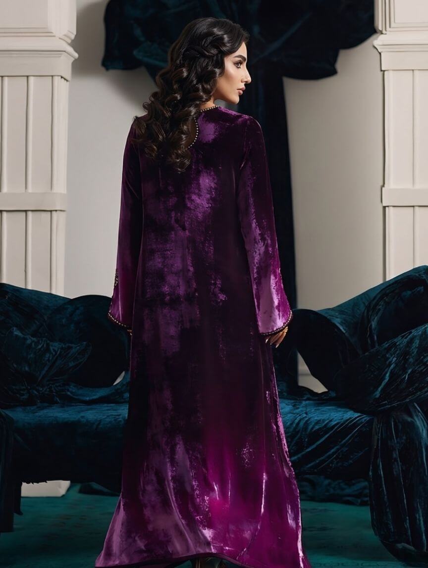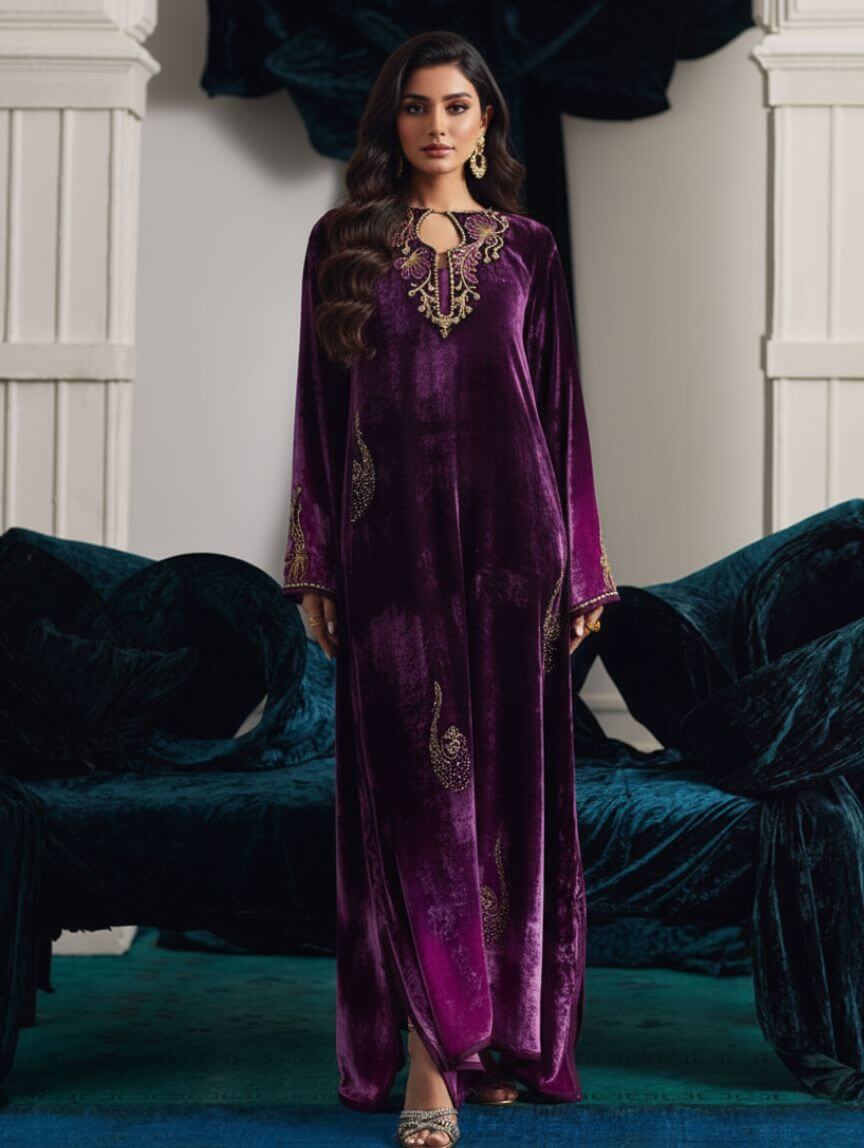Wrapped in rich plum velvet, this ombre kaftan is all about drama, grace, and that luxe Qimra Clothing signature. The embellished neckline steals the spotlight with intricate gold tilla, dabka, and Swarovski florals, while the embroidery flows seamlessly onto the sleeves. Shimmering sequins on the front add just the right amount of glow for evenings that matter. Perfect for weddings, festive soirées, or formal dinners, this piece pairs beautifully with statement earrings and soft glam makeup for a polished, unforgettable look.