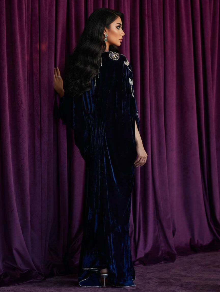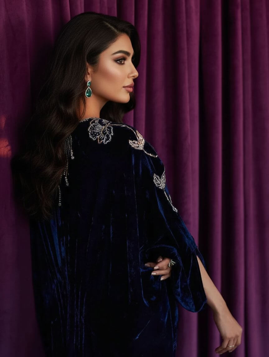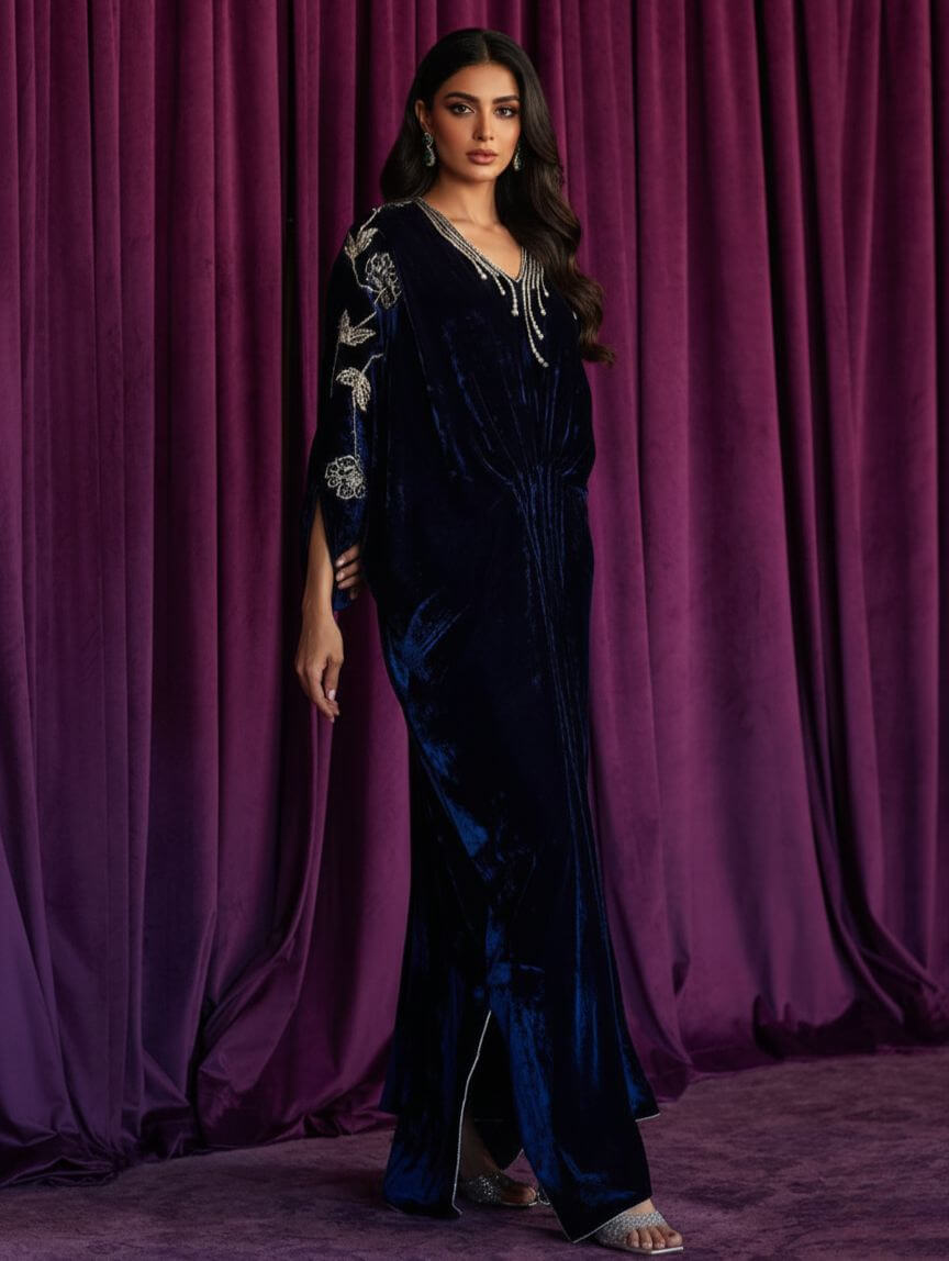 Drenched in a rich navy hue, this plush velvet kaftan is pure evening glamour with a refined luxury aesthetic. The hand-embroidered sequins along the neckline shimmer beautifully, while floral motifs blooming across the shoulders and sleeves add an elegant, feminine touch. Designed with a flattering V-neck, floor-length silhouette, and subtle side slits finished with a delicate silver border, it’s perfect for weddings, festive nights, or formal celebrations. Elevate the look with statement earrings, sleek heels, and a polished clutch for effortless, main-character energy.