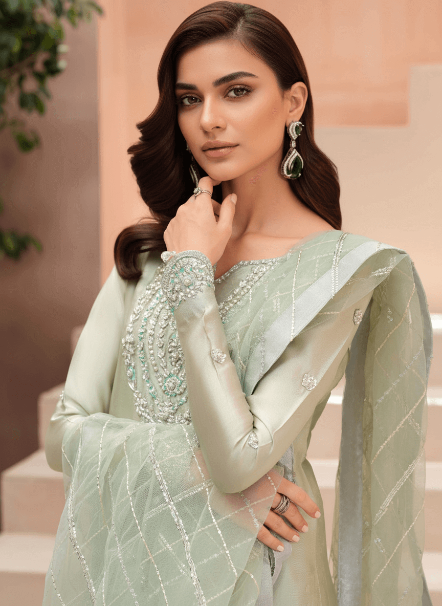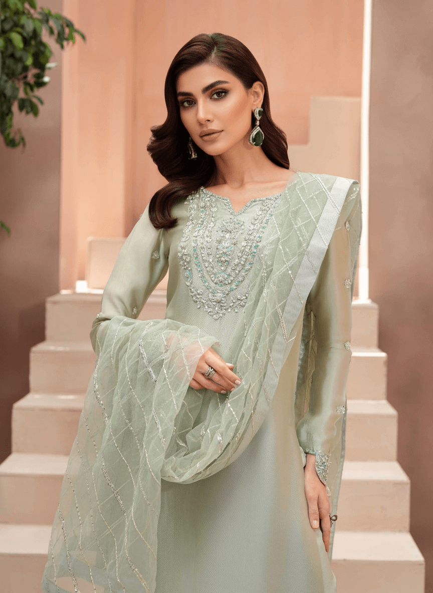 This elegant mint green ensemble is perfect for both grand occasions and intimate gatherings. The pure silk tissue shirt offers a rich fall and flattering drape, styled with a contemporary neckline adorned with delicate monotone embroidery for a refined touch. Paired with pk. raw silk pants and a net dupatta beautifully worked with fine detailing, this 3-piece outfit brings timeless grace to your wardrobe.