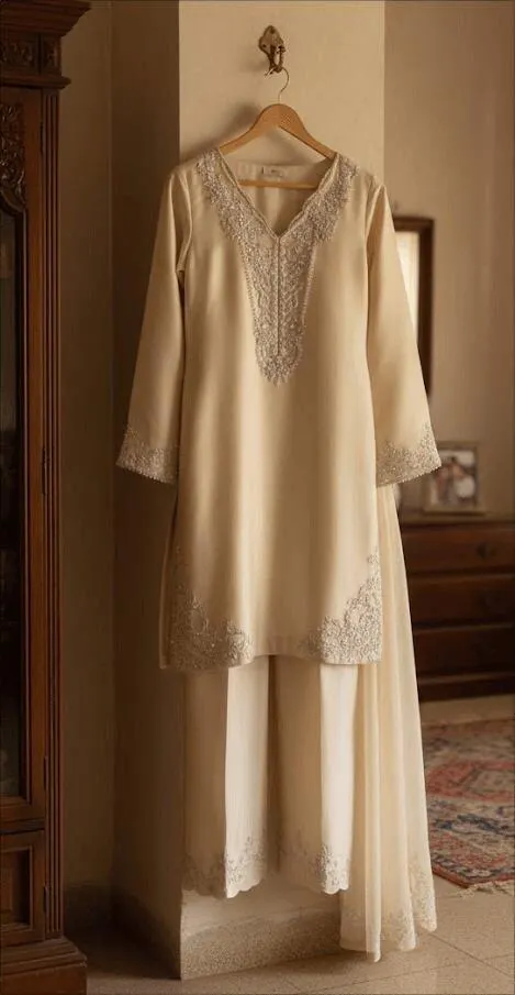 This outfit comes with a pure tissue silk shirt decorated with fine embroidery on the neckline and front panel, giving it a classy and graceful touch. It is paired with Korean raw silk trousers that have a smooth finish and light shine, perfectly matching the shirt. A soft organza dupatta completes the look, adding an airy and elegant feel to the buttercream shade. This outfit is a timeless choice for formal wear.