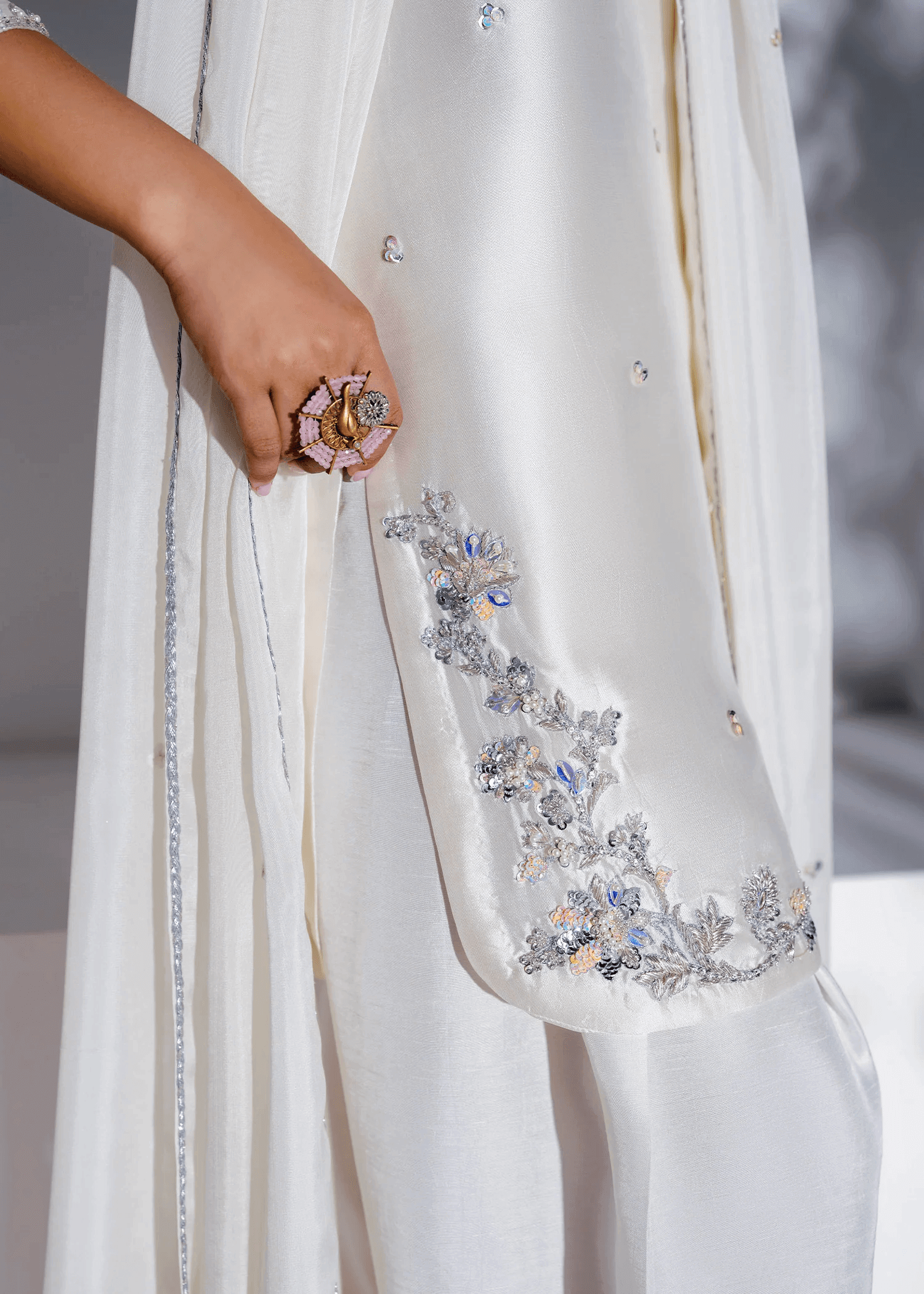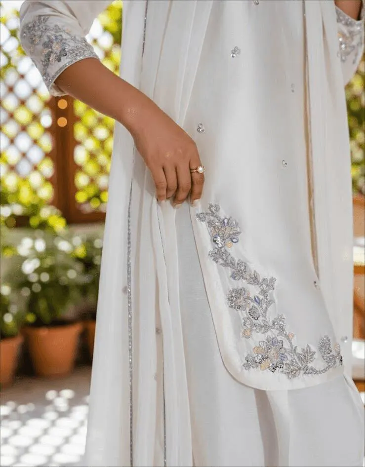 This stunning 3-piece comes in a swan white shade, giving a look of pure elegance. The pure silk tissue shirt features a deep circular neckline, highlighted with a hand-embellished 3D floral border that reflects fine craftsmanship. The fitted long sleeves carry the same delicate detailing, adding beauty to every edge. Paired with a PK Raw silk shalwar, decorated with hand-made silver 3D flowers, the outfit carries a touch of luxury in every stitch. A pure organza dupatta completes the set, softly sprayed with shimmering sequins that sparkle with every move. A timeless choice for weddings or special occasions.