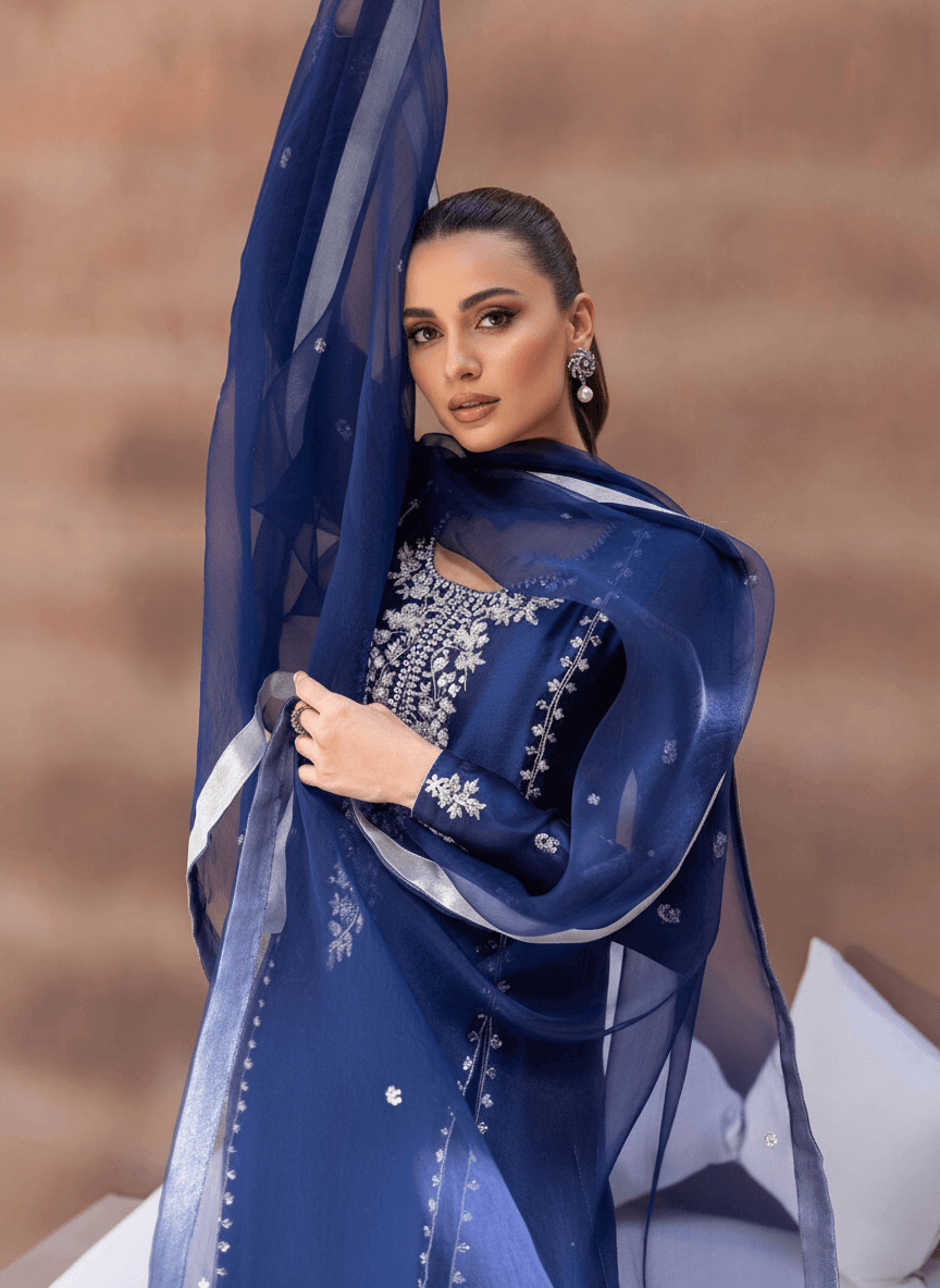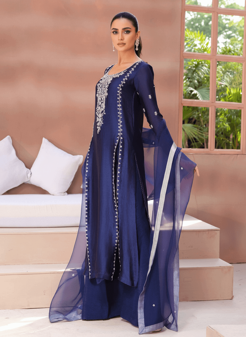 Get ready to be captivated by the irresistible allure of this enchanting ensemble, showcasing a mesmerizing midnight blue hue. Crafted to perfection from a blend of shiny tissue silk and organza, it emanates exquisite grandeur. The impeccably tailored shirt exudes timeless elegance, while the bootcut trousers add a touch of contemporary flair.