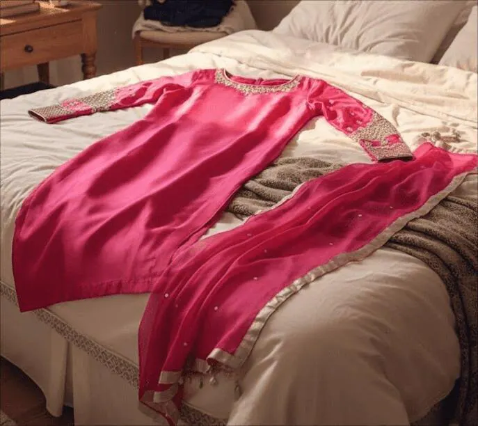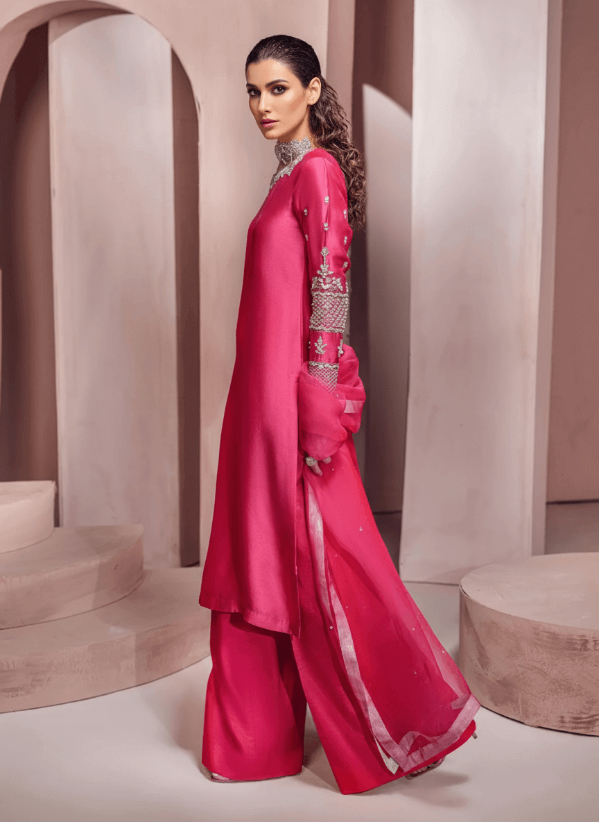 This striking hot pink silk tissue outfit makes a bold statement. The sleeves are decorated with intricate silver needlework, matched beautifully with white and silver embellishments on the neckline. Paired with pk. raw silk pants and a rhinestone-adorned organza dupatta, this 3-piece ensemble is both festive and timeless.