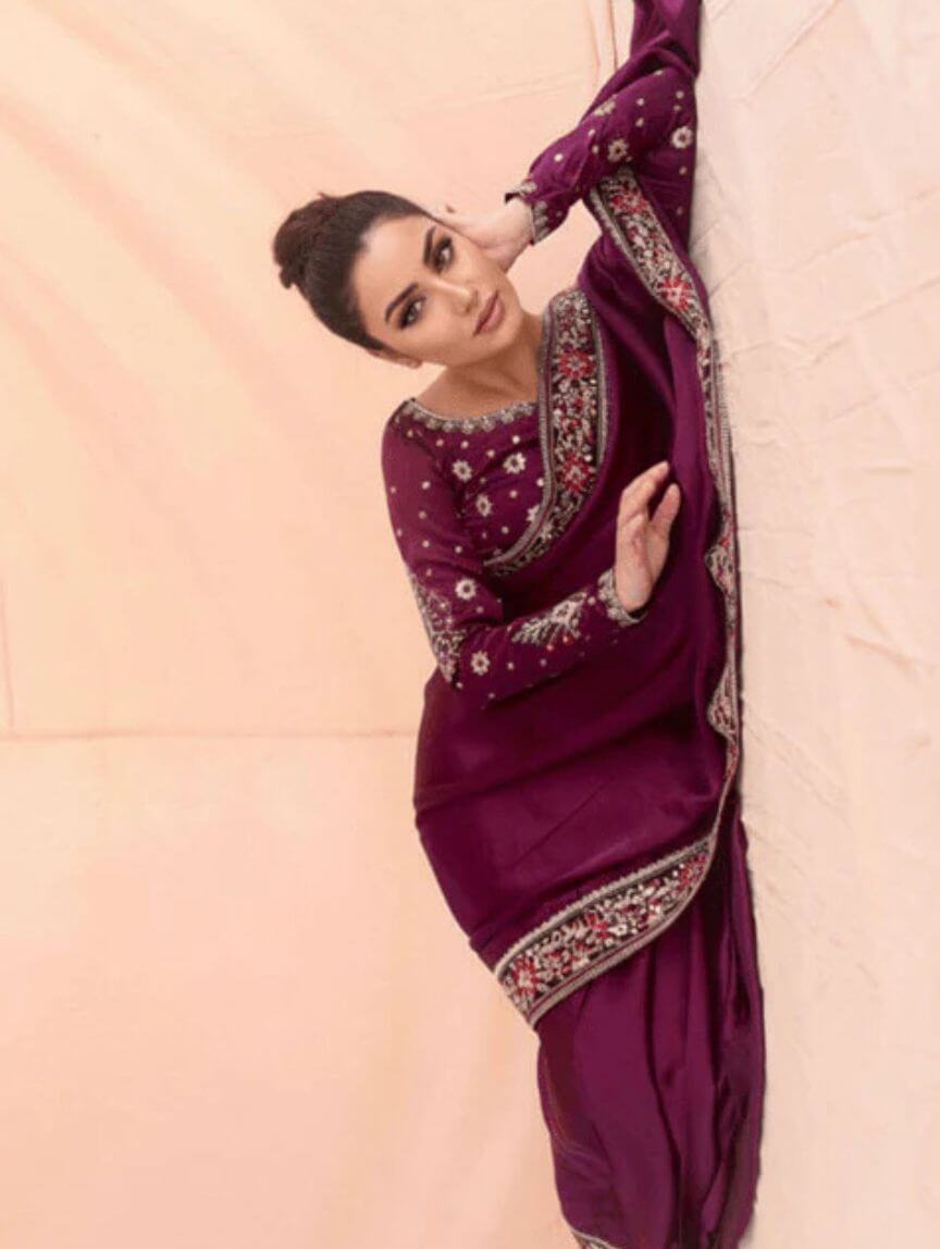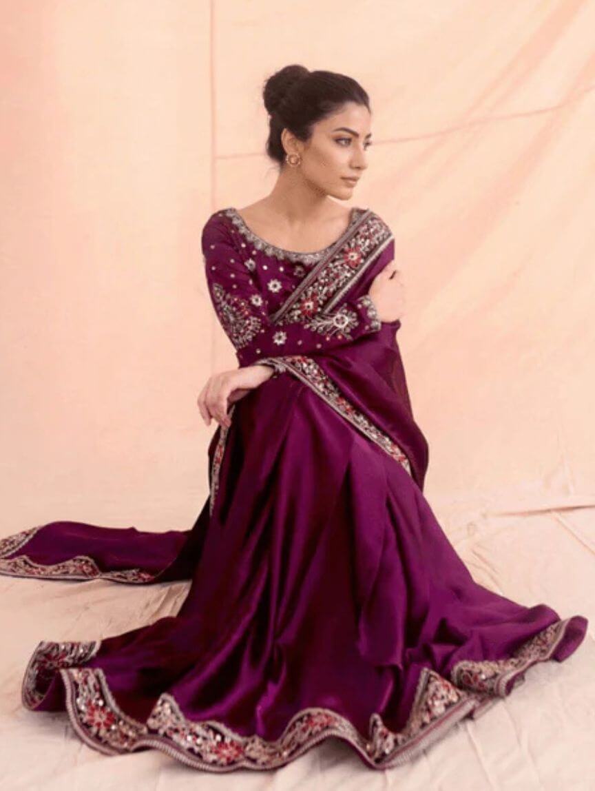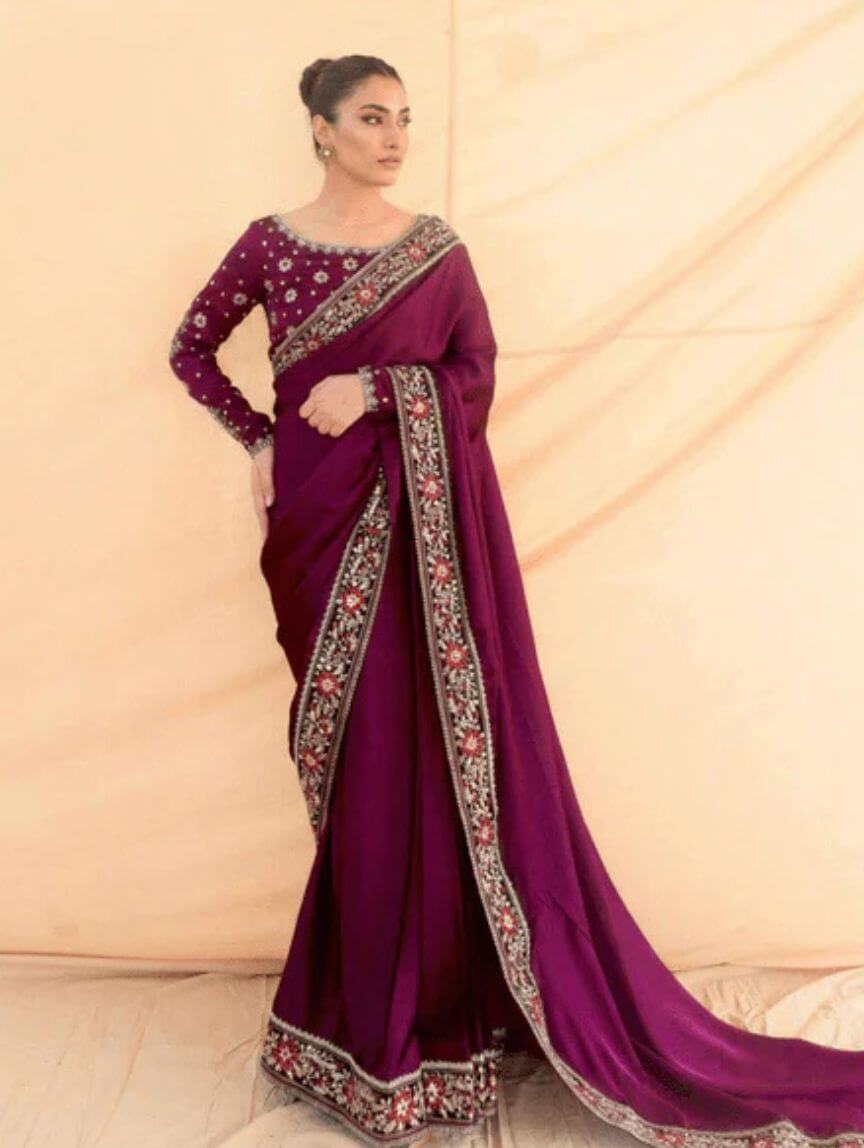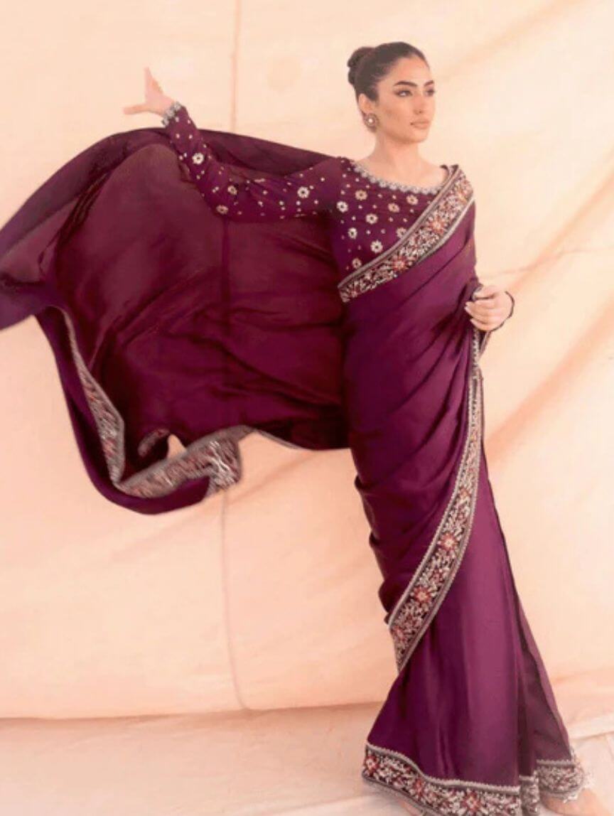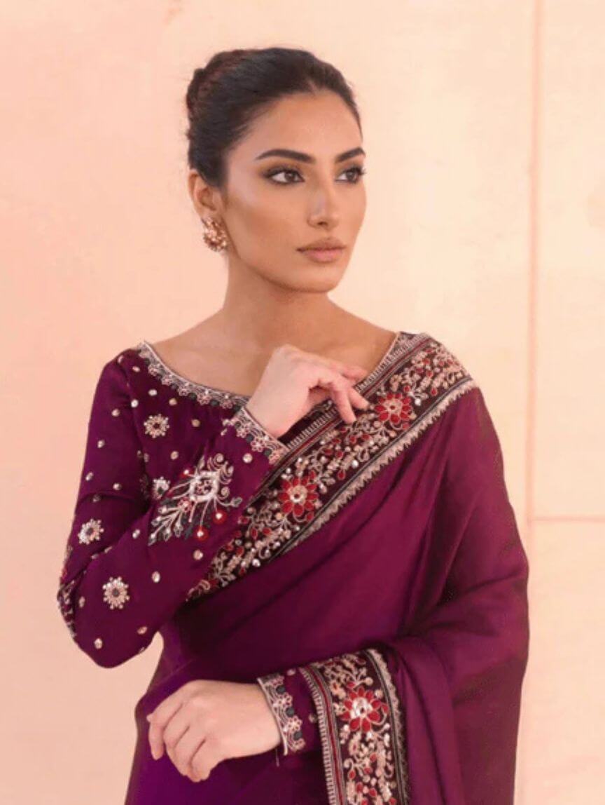 Make your festive evenings and wedding events unforgettable with Qimra Clothing’s stunning Plum Whisper ensemble. This 3-piece stitched set features a silk saree with pleats, a matching silk blouse, and a malai crepe petticoat for ultimate comfort and drape. The blouse shines with sequins, thread embroiderpy, floral motifs, and a delicate back bunch, while the saree flaunts a graceful 4-inch border for added charm. Its rich plum tone brings elegance and modern glam together seamlessly. Style it with statement accessories for a polished, spotlight-stealing look.