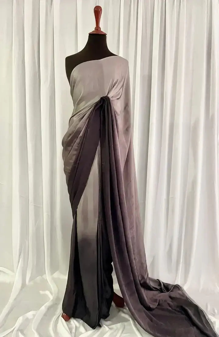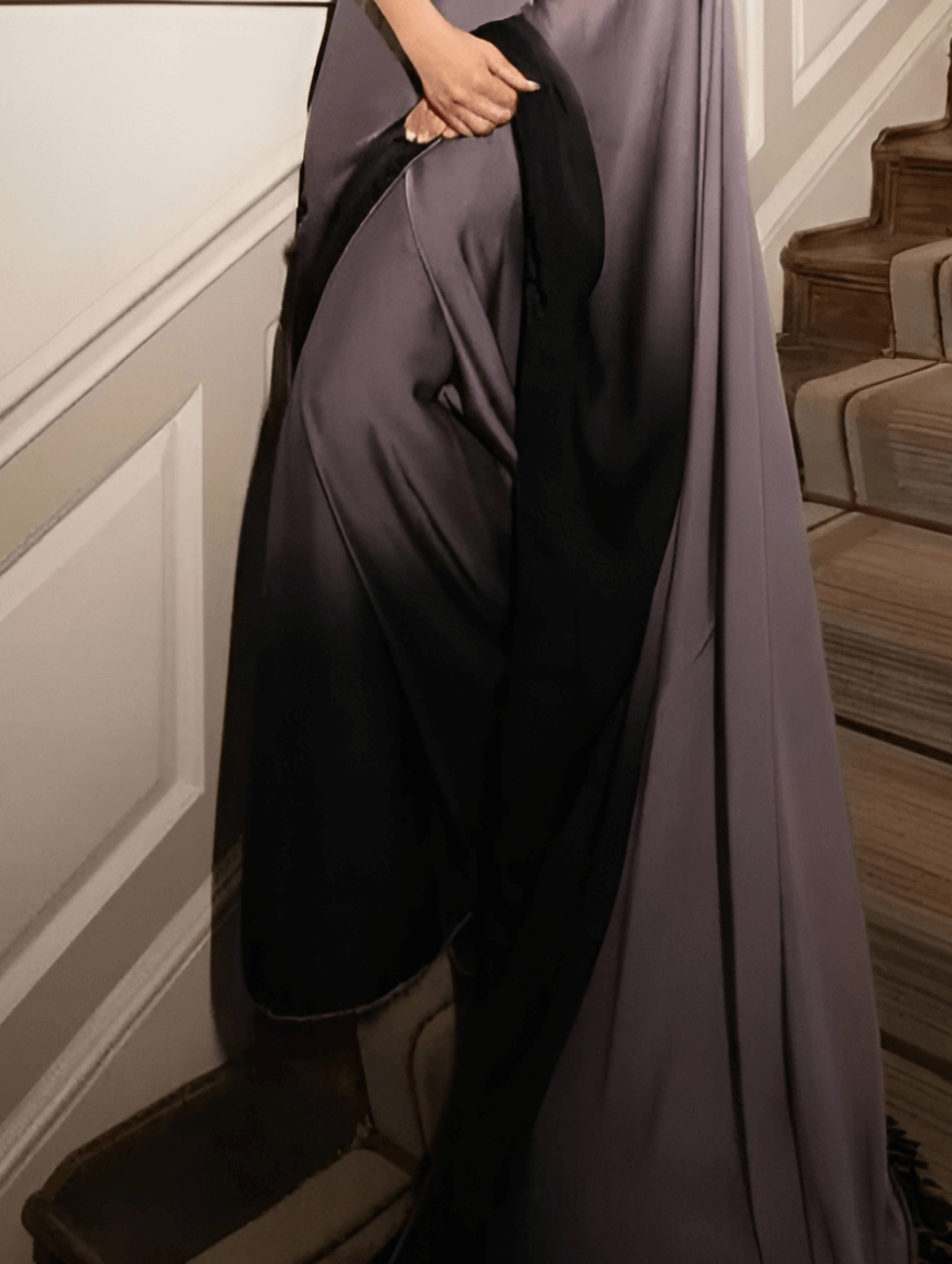Elevate your formal gatherings and evening soirées with our Prism ensemble, a luxurious 6-yard charmeuse silk saree in a chic ombré of steel, grey, and black. Soft, buttery, and perfectly draped, this saree offers effortless comfort while exuding refined glamour. The matching one-yard blouse with sleeves completes the seamless look, perfect for weddings or elegant dinners. Hand-dyed using traditional techniques, each piece carries its own unique charm. Amp up your style by pairing it with minimalistic accessories or bold, smoky eyes for a sleek, statement-ready finish.