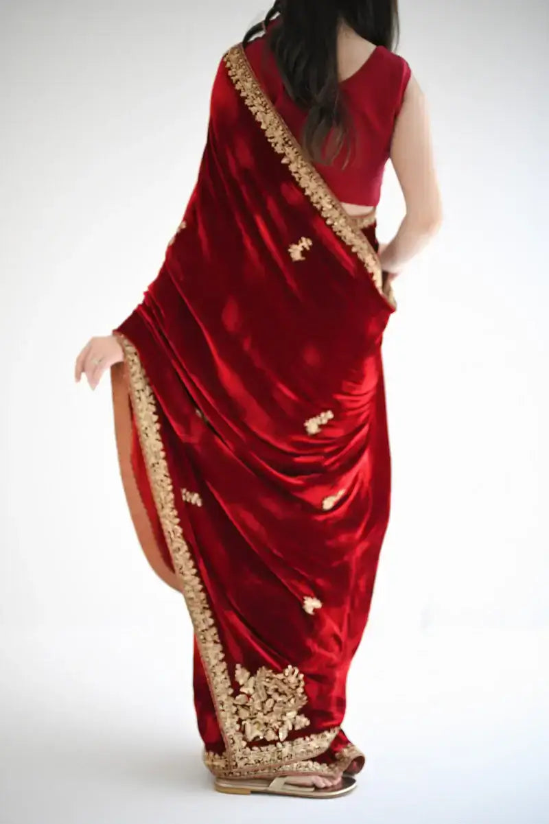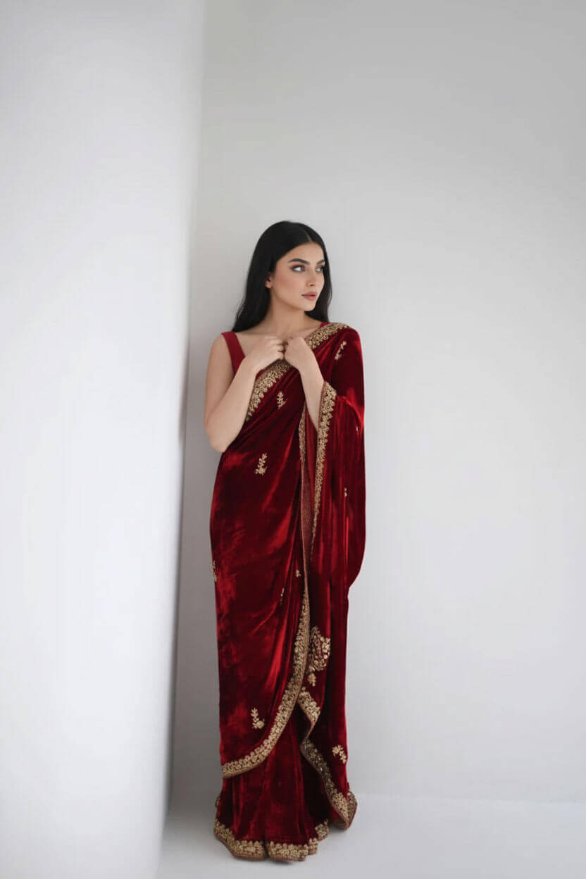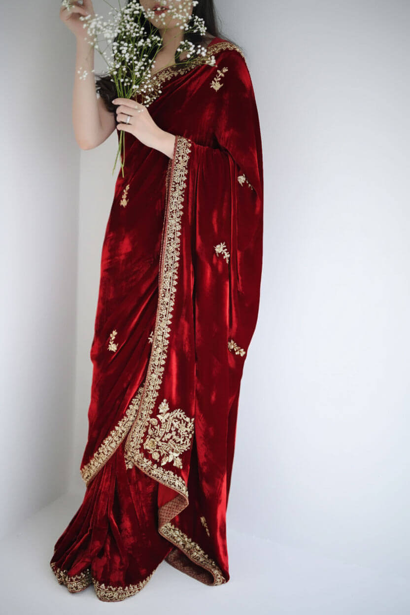 Turn every festive moment into a show-stopping entrance with our Rogue saree, a stunning stitched pure velvet saree crafted for girls who adore rich, dramatic elegance. The deep red drape is heavily embellished with gold and antique hand craftsmanship, perfected by skilled artisans, and paired with a stitched pure raw silk blouse for a luxurious finish. Ideal for weddings, receptions, and glamorous evening events, this look blends bold charm with timeless sophistication. Complete your vibe by pairing it with Qimra bangles for that final, irresistible sparkle.
