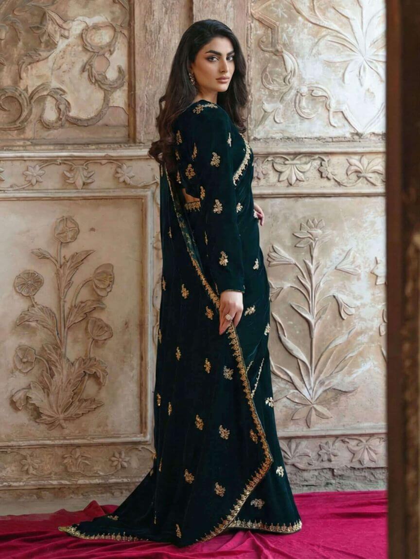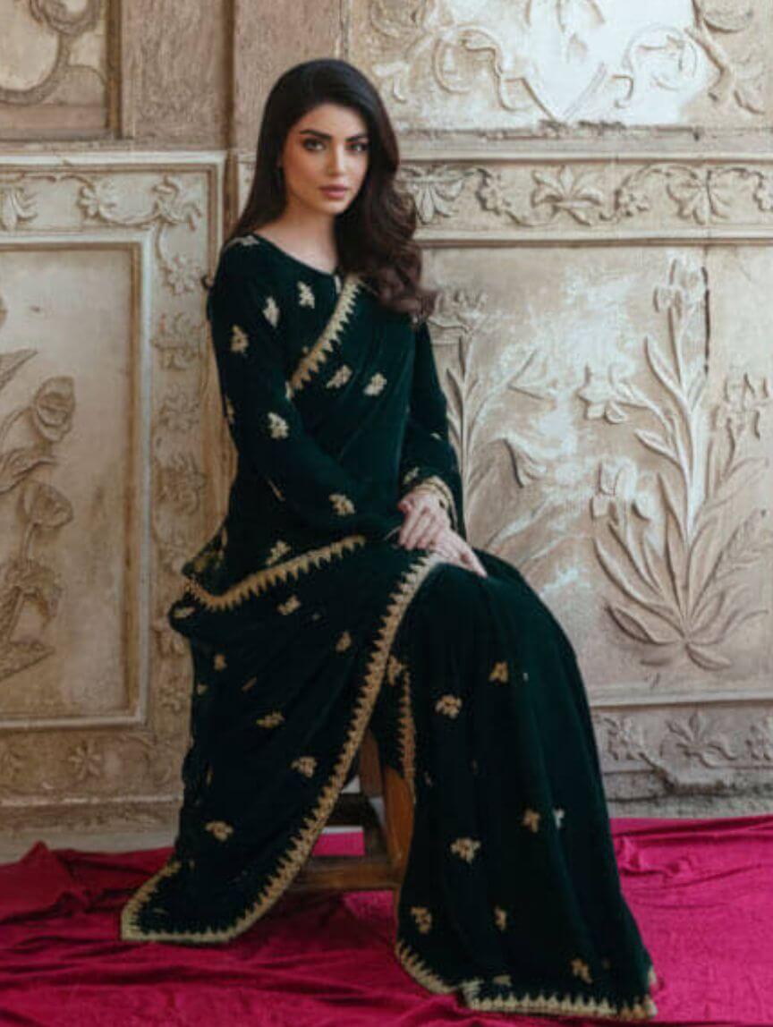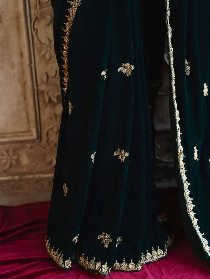 Wrap yourself in winter elegance with Qimra Clothing’s Sage, draped in plush forest-green velvet that brings drama, warmth, and luxurious depth. Softly gleaming zardozi floral work scatters across the fabric like jeweled constellations, creating a look that feels graceful and effortlessly memorable. Designed for winter weddings, festive evenings, and grand celebrations, this saree lets you move with ease while still commanding attention. Its richness adds a grounded yet glamorous presence, perfect for moments where you want your style to speak before you do.